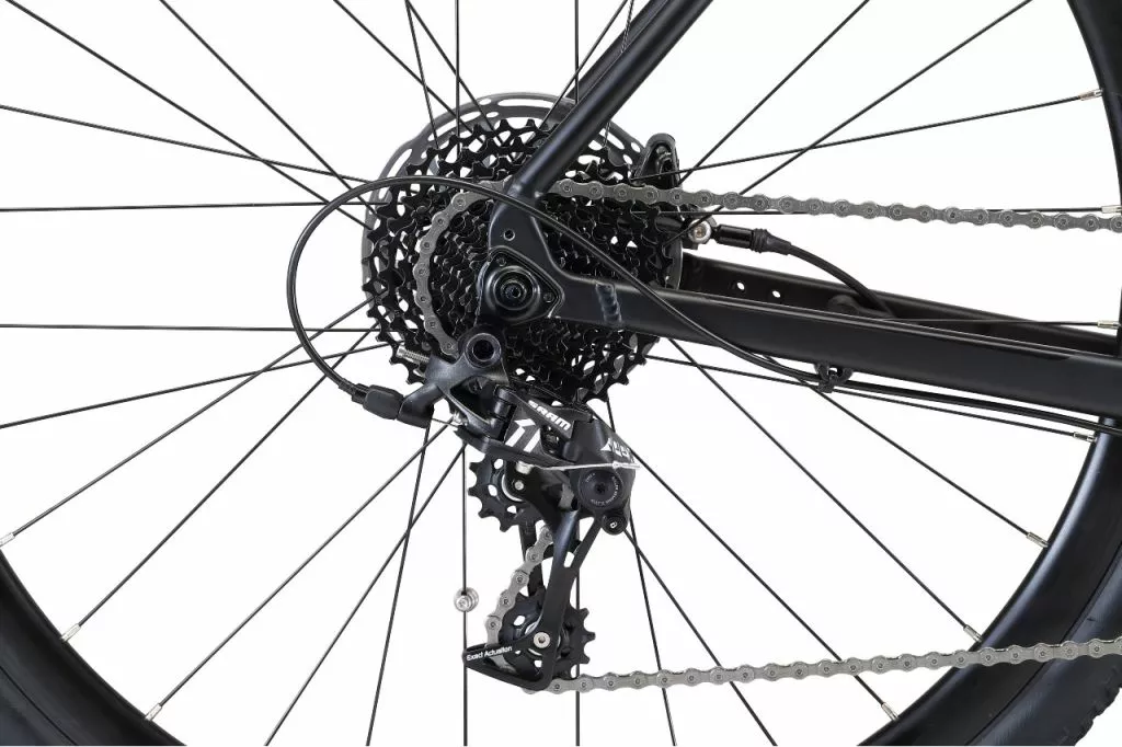 SRAM has been ahead of Shimano for gravel, mountain biking and now road. Their drivetrains are super durable. A neat stabiliser unit in the rear derailleur ensures the chain doesn’t slap around and accidentally derail off the chain ring. Full hydraulic disc brakes are a must on E-Bikes. The Apex naturally uses SRAM’s hydraulic disc brakes because they integrate perfectly and deliver superb power and modulation on steep, fast descents. The Apex 1 groupset is clean and efficient. It has no and requires no front gears. It therefore doesn’t have a front derailleur, shifter and cable – minimising moving parts.